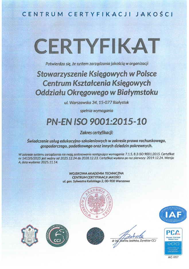 W dniu 21 czerwca 2011 r. uzyskaliśmy zaświadczenie wydane przez Departament Edukacji Urzędu Miejskiego w Białymstoku potwierdzające, że Stowarzyszenie Księgowych w Polsce Centrum Kształcenia Księgowych Oddziału Okręgowego w Białymstoku zostało wpisane do ewidencji placówek oświaty pozaszkolnej pod poz. 121. Zatem jesteśmy jednostką objętą systemem oświaty w rozumieniu przepisów o systemie oświaty.